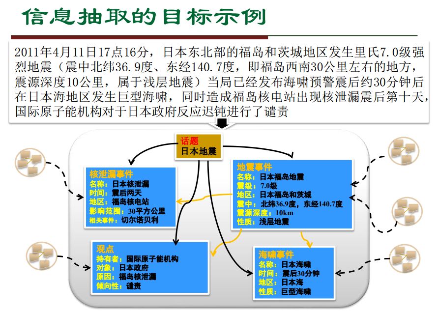 下面是一个例子,从2011年的7级地震,相信不少人还记忆犹新,尤其是他的福岛核电站,那些年我们还抢过紫菜来着对吧。将一条新闻中的重点信息进行抽取和结构化,形成下面的形式,就是信息抽取。