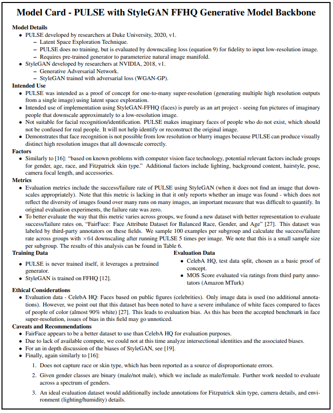 作为对质疑的回应,PULSE这篇论文的作者就在原文的第6节加入了对模型偏见的讨论,并在附录中加入了一张“model card”,其中写道,相比于 CelebA HQ(基于公众人物(名人)的人脸数据集),FairFace或许是评估模型时的更好选择。