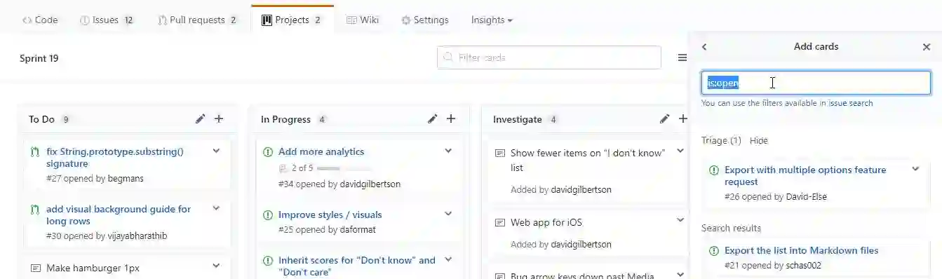 如果你想把你的issues添加到你的项目管理中来,你可以在页面右上方点击Add Cards搜索你想添加的,这里的搜索有特殊的语法(https://help.github.com/articles/searching-issues-and-pull-requests/),比如输入is:pr is:open,意味着你可以找到所有打开的PRs,如果你想修复bugs,输入label:bug。