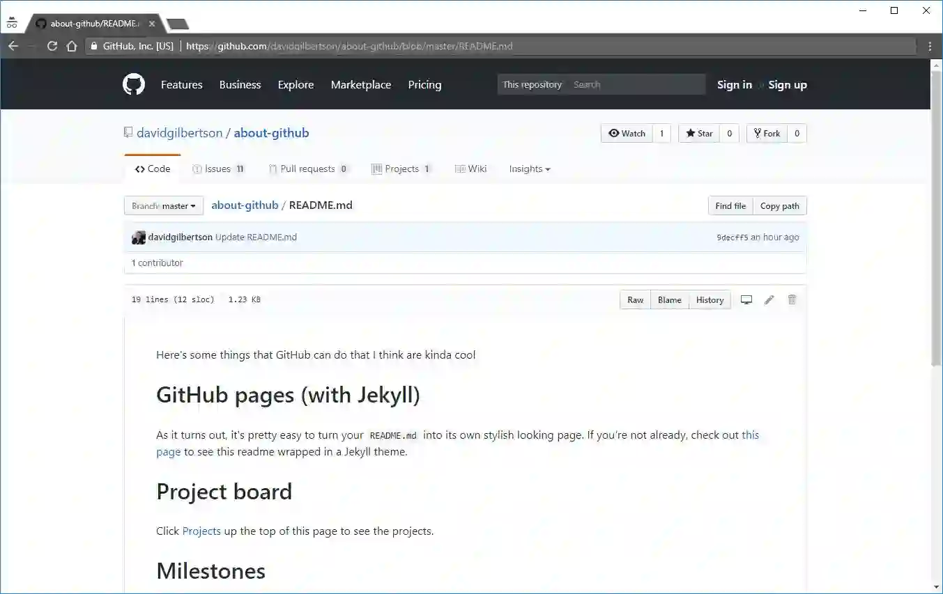 非常简单,Jekyll会用漂亮的主题去渲染你的README.md文件。比如这个README页面(https://github.com/davidgilbertson/about-github):