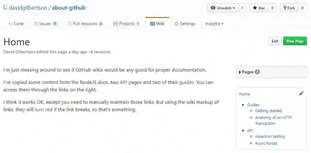 我先创建一个GitHub wiki,我从NodeJS文档找了几个页面作为wiki的页面,然后创建一个侧边导航来模拟实际的结构。侧边栏一直存在,不会对当前页面高亮。