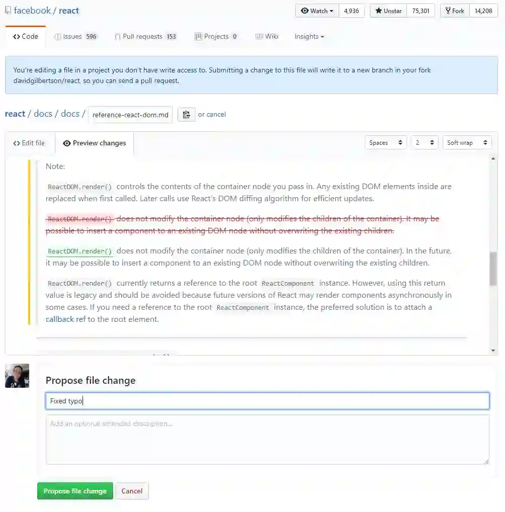 在GitHub上打开一个文件(任何仓库的任何文件),在页面的右上角有一个像小铅笔的按钮。点击它,你就可以编辑文件了。当你编辑完成,点击Propose file change,GitHub将为你fork这个仓库,然后创建pull request。