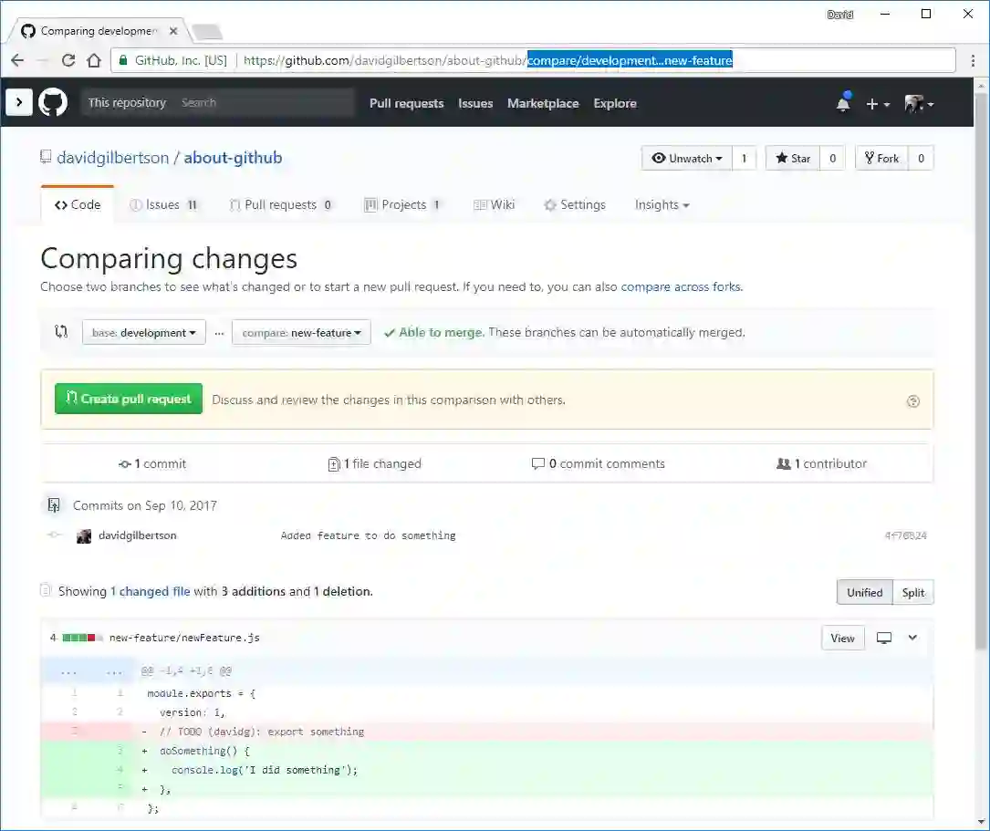 GitHub的页面导航已经做的很好了,但是有些时候直接在导航栏中输入会更快。比如你想跳转到一个分支,看下它与主干的区别,就可以直接在你仓库的后面输入/compare/branch-name: