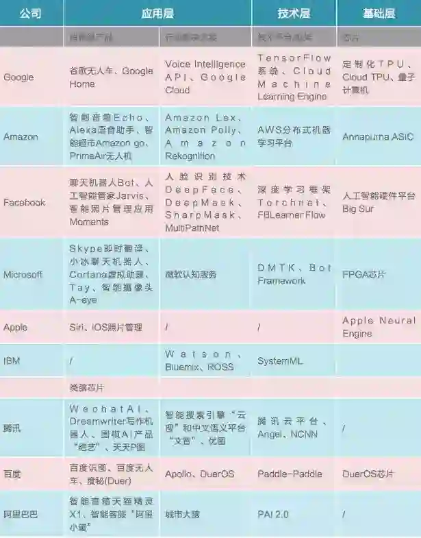 引领AI产业发展的技术竞赛,主要是巨头之间的角力。目前,苹果、谷歌、微软、亚马逊、Facebook五大巨头都在人工智能领域部署更多的资源;不仅国外巨头如此,国内的BAT都卯足马力,积极布局人工智能。