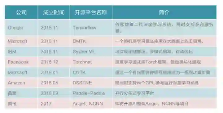 人工智能的常见开发框架包括谷歌的TensorFlow、Facebook的Torch、Microsoft的CNTK 以及IBM的SystemML。这些框架的地位类似于人工智能时代的iOS/Android。开源也成为了这些 软件开发框架共同的策略。