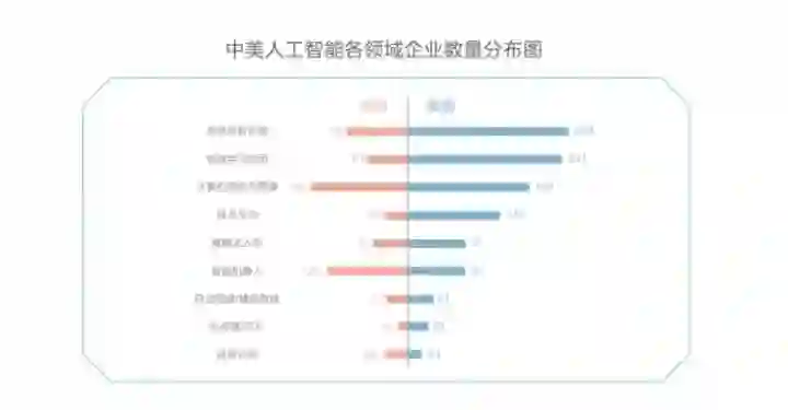总体来看,美国在企业数量上全面领先中国,基础层和技术层的企业数量约为中国的2倍,但是在应用层上,中国和美国的差距略小。