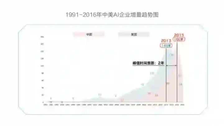 从现有统计上看,美国人工智能企业从1991年开始创建,从1991年--1997年历经萌芽时期,1998年--2004年阶段经历发展期,2005年--2013年阶段历经高速成长期,2013年至今进入平稳阶段。
