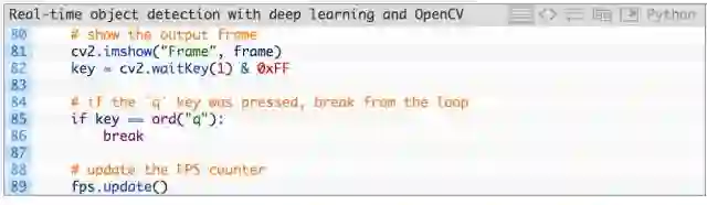 上述代码块简单明了,首先我们展示帧(第 81 行),然后找到特定按键(第 82 行),同时检查「q」键(代表「quit」)是否按下。如果已经按下,则我们退出帧捕捉循环(第 85、86 行)。最后更新 fps 计数器(第 89 行)。