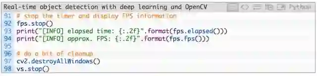 当我们跳出(exit)循环,fps 计数器 停止(第 92 行),每秒帧数的信息向终端输出(第 93、94 行)。