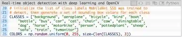 在第 22-26 行,我们初始化 CLASS 标签,和相应的随机 COLORS。有关这些类的详细信息(以及网络的训练方式),请参考:http://www.pyimagesearch.com/2017/09/11/object-detection-with-deep-learning-and-opencv/