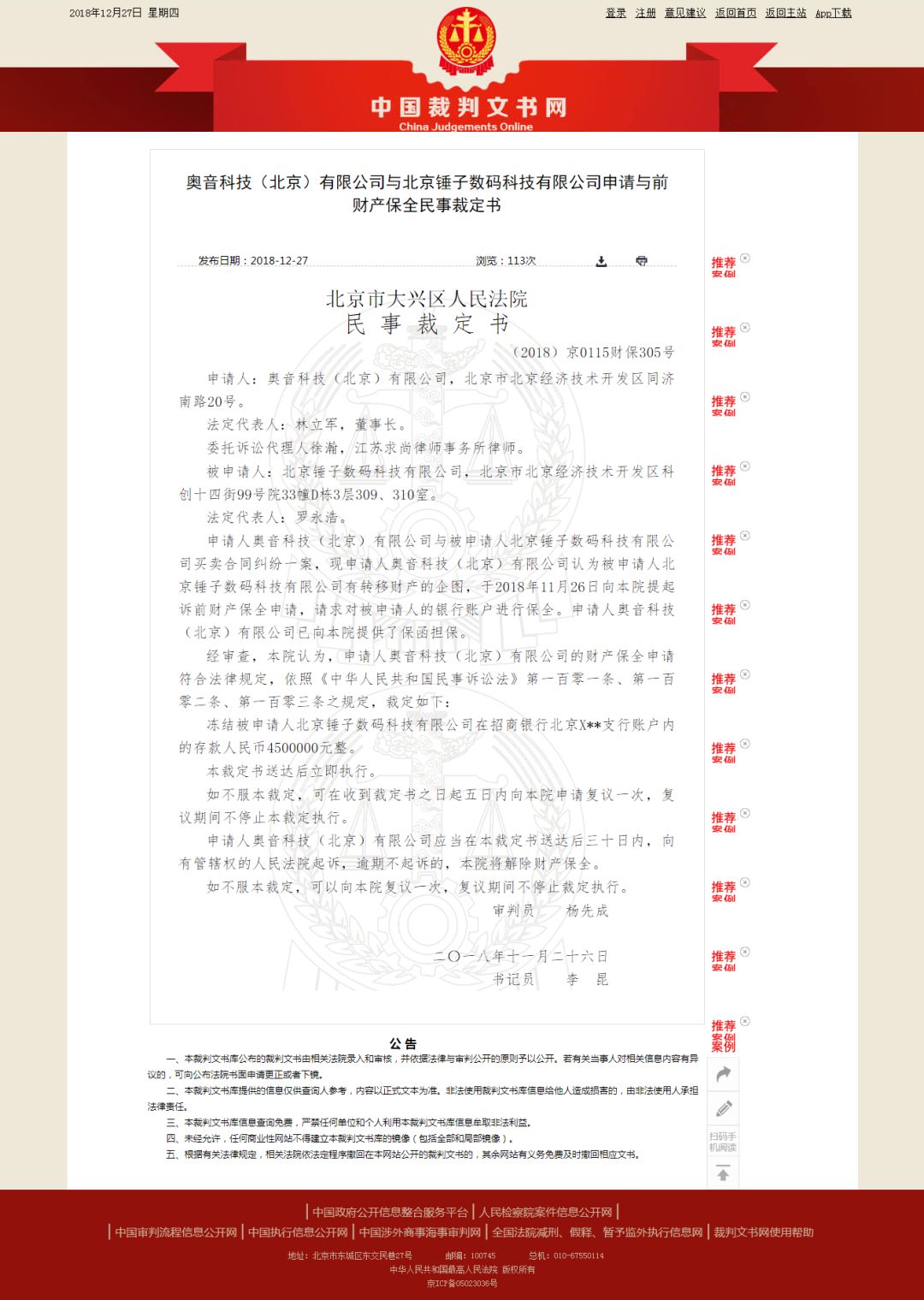 12月27日上午,因怀疑有转移资金的企图,锤子科技被奥音科技(北京)有限公司申请诉前财产保全,法院裁定将冻结锤子科技在招商银行的存款人民币450万元整。
