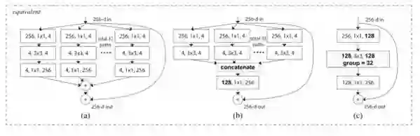 这看起来可能很熟悉,因为它跟[4]中的Inception模块非常相似。在这个变体中,不同路径输出的合并是通过相加来实现的,除此之外,它们都遵循了“分割-转换-合并”范例,而在[4]中它们却是深度串联(depth concatenated)的。另外一个区别在于,在[4]中,每一个路径互不相同,而在这个架构中,所有的路径都遵循了相同的拓扑结构。