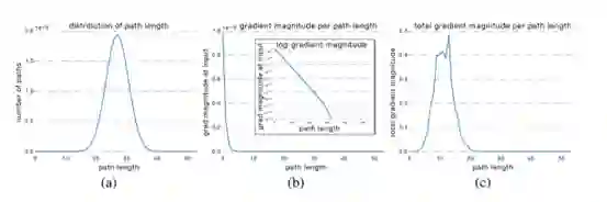 我们现在可以将每一路径长度与其期望的梯度大小相乘,看每一路径长度在训练中起到多大的作用,就像(c)图。令人惊讶的是,大多分布都来自于9到18的路径长度,但它们都只包含少量的总路径,如(a)图。这是一个非常有趣的发现,因为这暗示着ResNet无法解决过长路径的梯度消失问题,ResNet的成功实际上源自于它缩短了它的有效路径(effective path)的长度。