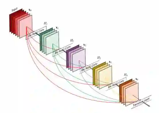 [9]的作者提出了一个叫作DenseNet的新网络结构,这个结构进一步使用了shortcut connections,将所有的层互相连接起来。在这个新架构中,每一层的输入都包含了所有较早的层的feature maps,而且它的输出被传递至每个后续层。这些feature maps通过depth concatenation在一起。