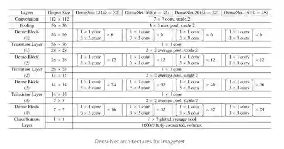 根据这种范例,我们知道第l层输入feature map的数量会有k*(l-1)+k_o个,其中的k_0是输入图像中的通道数目。作者们使用一个叫做“增长率”(k)的超参数防止网络变得过宽,他们还用了一个1*1的卷积瓶颈层在3*3卷积前减少特征映射的数量。整体架构如下表所示: