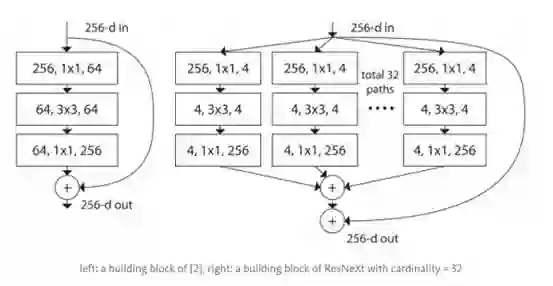 左边是[2]中所提到的残差块;右边是基数为32的ResNeXt构件