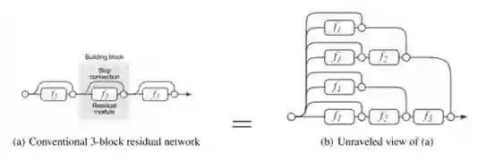 [10]一文的作者们提出了一个训练一个深度网络的“反直觉”方法,即在训练中任意地丢弃网络的层,并在测试中使用整个网络。Veit等人[12]介绍了一个更加“反直觉”的发现:我们可以删除经过训练后的ResNet中的部分层,同时保持相当不错的网络性能。这样一来ResNet架构就变得更加有趣了,因为在Veit等人的论文中,作者对VGG网络做了同样的操作,移除了一个VGG网络的部分层,而VGG网络的性能出现了显著的退化。
