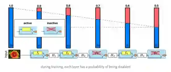 ResNet的强大性能在很多应用中已经得到了证实,尽管如此,ResNet还是有一个不可忽视的缺陷——更深层的网络通常需要进行数周的训练——因此,把它应用在实际场景下的成本非常高。为了解决这个问题,[10]的作者们引入了一个“反直觉”的方法,即在我们可以在训练过程中任意地丢弃一些层,并在测试过程中使用完整的网络。