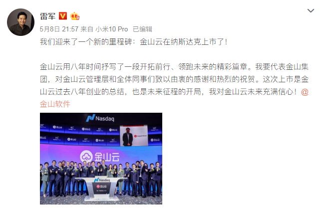 5月8日晚间,雷军通过个人微博发文祝贺金山云上市,“我们迎来了一个新的里程碑:金山云在纳斯达克上市了!”