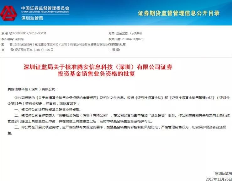 雷锋网消息,据证监会公开信息披露,深圳证监局已于近日发布关于核准腾安信息科技(深圳)有限公司证券投资基金销售业务资格的批复。批复原文中显示,腾安公司将更名为腾安基金销售(深圳)有限公司,允许在公司经营范围中增加“基金销售”业务。