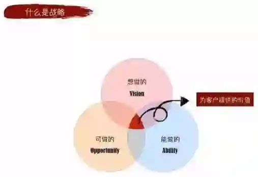 什么东西你能做?无论是资源、人还是组织建设的能力,哪些东西是你能做的?中间的小小交集就是你该做的,想做、可做、能做,这三个条件都符合,才是真正该做的,这就是你的战略。