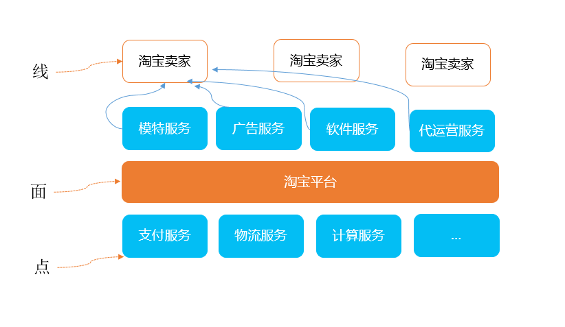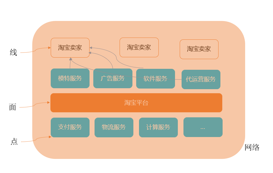 在淘宝平台这个面上,要让淘宝卖家赚到钱,淘宝才能发展。模特服务、广告服务等都是为线(卖家)或者面(淘宝平台)服务的。