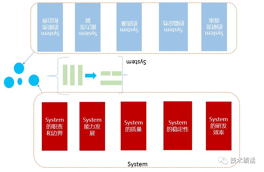 如上图所示,System 的 owner,从系统的角度是一个点。但从功能(Func)到 System 的角度可以是一个面的变化。包括有平台能力视角、稳定性视角、运维视角。