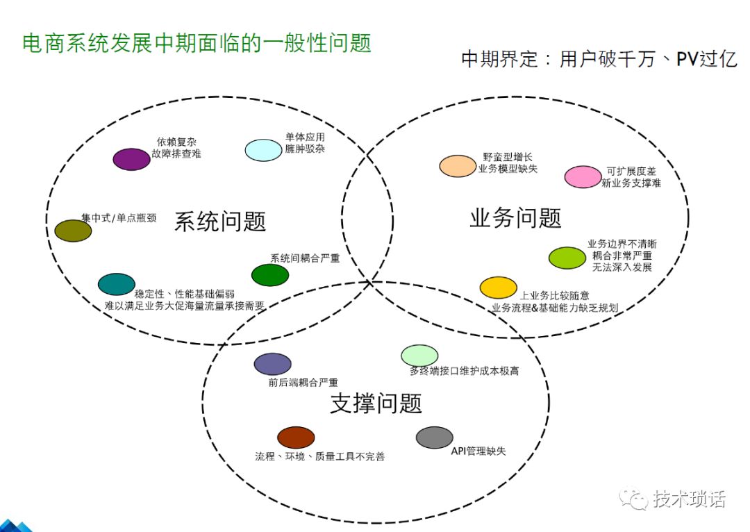 我们可以看一个例子,电商系统发展面临的问题。包括有有系统问题、业务问题、技术支持问题。