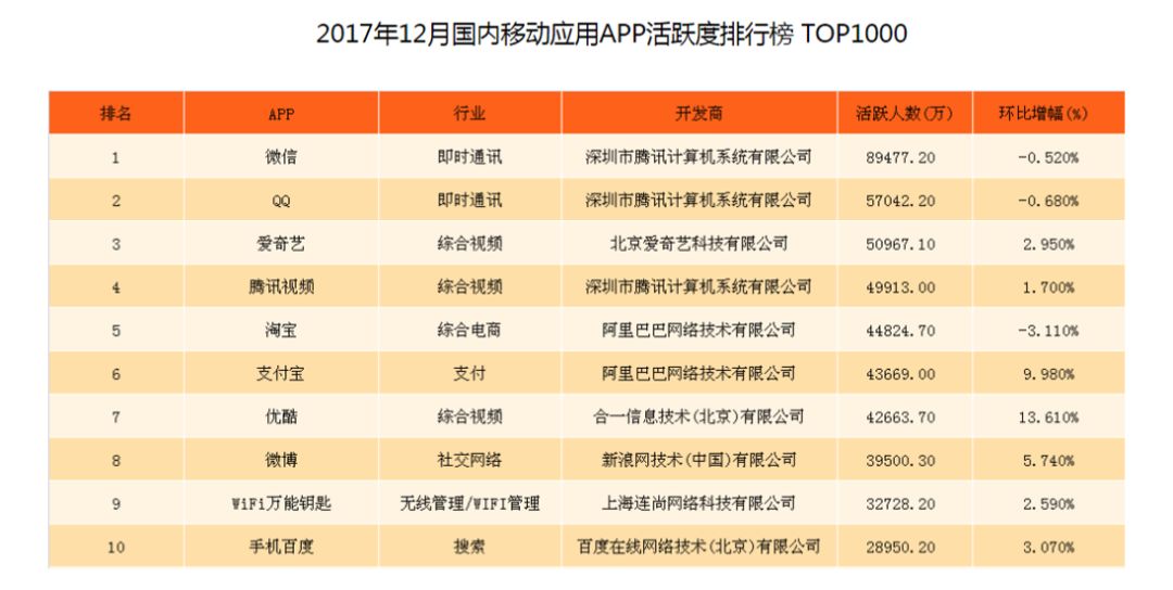 上图为某机构公布的 2017 年 12 月国内 App 活跃度的数据。可见最 hot 的 App,它的行业划分不是搜索。搜索已经内化为 App 内部生态的基础服务和能力。