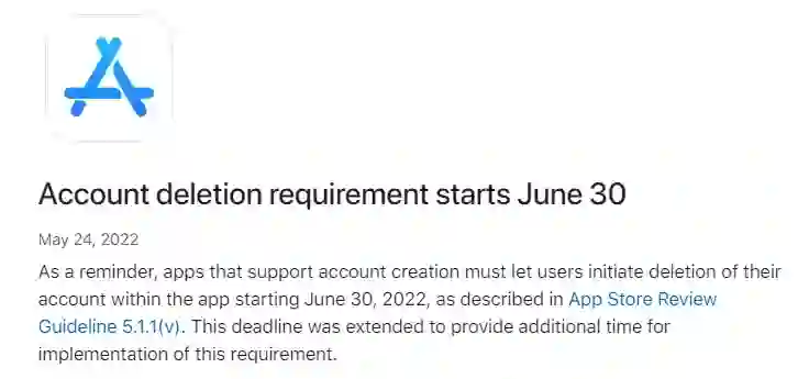 从去年开始,苹果多次要求开发者在 App 内设置账号删除选项,现在苹果为这一规则实施设置了最后期限,苹果官方在今日宣布支持帐户创建的应用程序必须允许用户从 2022 年 6 月 30 日开始在应用程序中删除其帐户。