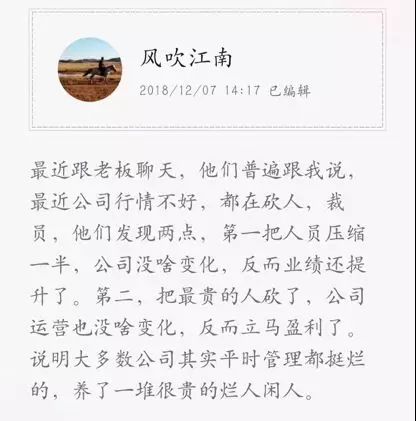 这也是为什么会出现文章开头说的,把人员压缩一半,公司没啥变化,反而业绩提升了,把最贵的人砍了,公司运营也没啥变化,反而盈利了。