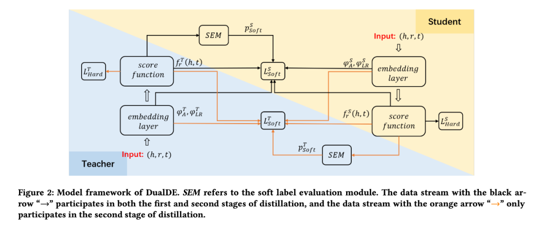 准备一个预训练好的高维 KGE 模型(教师),并随机初始化一个低维 KGE 模型(学生)。在 DualDE 中,训练学生模型的硬标签损失是KGE方法的原始损失,通常是二元交叉熵损失。此外,我们让学生从目标三元组的整体可信度和嵌入结构这两个方面模仿教师。