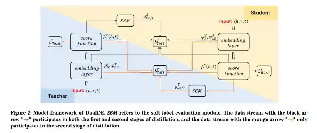 事实上,KGE 方法对不同三元组的掌握程度是不同的。对于一些难以被 KGE 方法掌握三元组,他们通常难以获得可靠的分数。让学生按照不可靠的分数模仿老师,会给学生模型带来负面影响。为了获得更好的蒸馏效果,我们建议学生应该能够评估老师提供的软标签的质量并且有选择地向他们学习,而非一视同仁地学习。我们在 DualDE 中引入了软标签评估机制来评估老师提供地软标签质量,并自适应地为不同地三元组分配不同的软标签和硬标签权重,这将保留高质量软标签的积极作用并避免低质量软标签的负面影响。