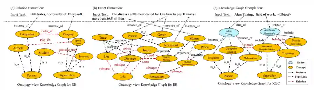 在本文中,外部的本体知识表示为 O={C,E,D},其中 C 是一组概念,E 是本体论之间的边,D 是每个本体知识的文本描(本体框架包含一段文本描述,它们是概念的词汇信息,也可以使用属性信息,记作 rdfs:comment)。我们在关系抽取和事件抽取中利用与实体相关的类型本体,在知识图补全中利用 Domain(即头部实体类型)和 Range(即尾部实体类型)约束。对于下游不同任务,我们对每个任务利用不同的本体源进行本体线性化转换。我们首先从外部知识图谱中提取每个实例的本体,然后将这些本体转换为文本形式作为辅助提示,并拼接到原始的提示末尾。