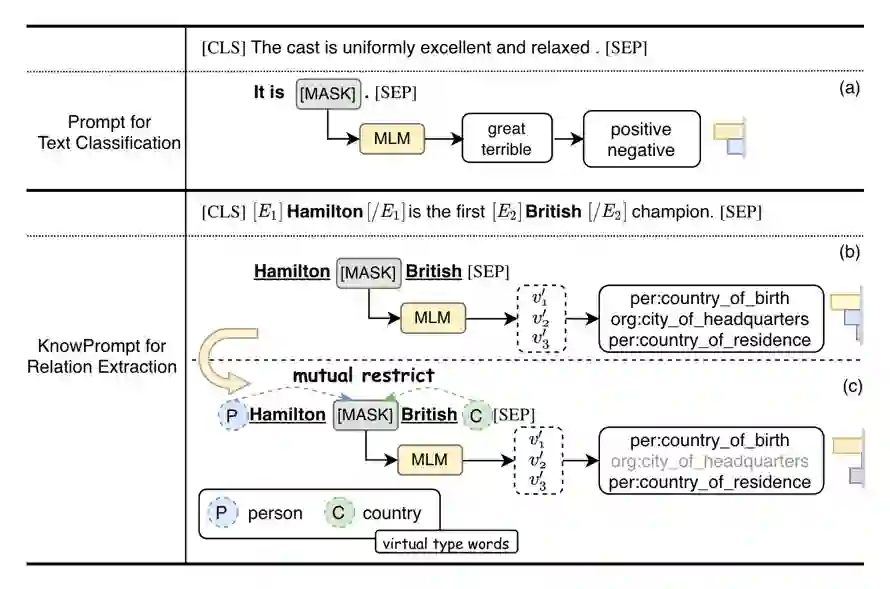 提示学习在具体的任务中面临诸多挑战。以关系抽取(RE)为例,如下图所示:一方面,为关系抽取构建合适的提示模板需要专业的领域知识,且模板需要大量的验证集进行验证,成本高昂;另一方面当关系抽取的标签的个数发生变化时,标签词搜索过程的计算复杂度非常高(通常与类别个数呈指数关联),因此较难在语言模型词汇表中针对特定的关系标签获得合适的标签词。我们观察到,关系标签之间存在丰富的语义知识,即关系三元组之间存在结构约束。例如,如果一对实体包含“person”和“country”的类型,则 [MASK] 在关系“org:city_of_headquarters”上的预测概率会相对较低。此外,关系也约束它的实体的类型。