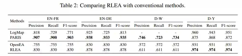 同时,本文还与传统实体对齐方法进行了对比。在此之前,尽管基于知识图谱嵌入的方法具有许多优点,但在绝对性能上与基于字符匹配等技术的传统方法有着较大差距。本文所提出的基于强化学习的方法不但缩小了这一差距,并且在一些数据集上(如D-Y)显著优于传统方法。