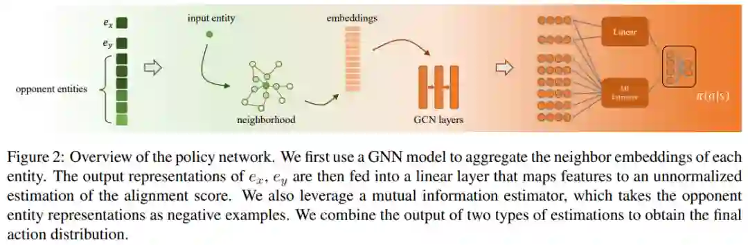下图展示了策略网络的基本构成,对于输入实体和候选实体,我们选择了额外k个与输入实体接近的实体(即 opponent entities)作为context信息,可以用于拒绝当前匹配。对于每个实体,我们使用GNN模型同时编码其邻居向量以得到中间表示。除了线性层以外,最终的输出层还考虑了实体对间的互信息,综合两个评估器得到最终的输出标签,即匹配或不匹配。