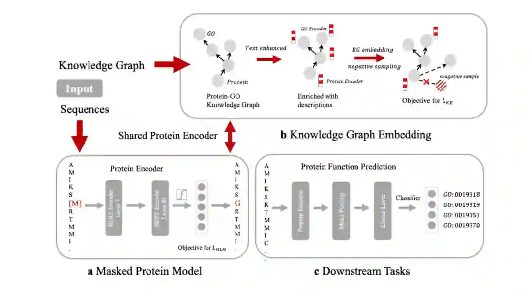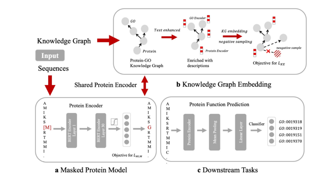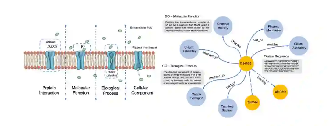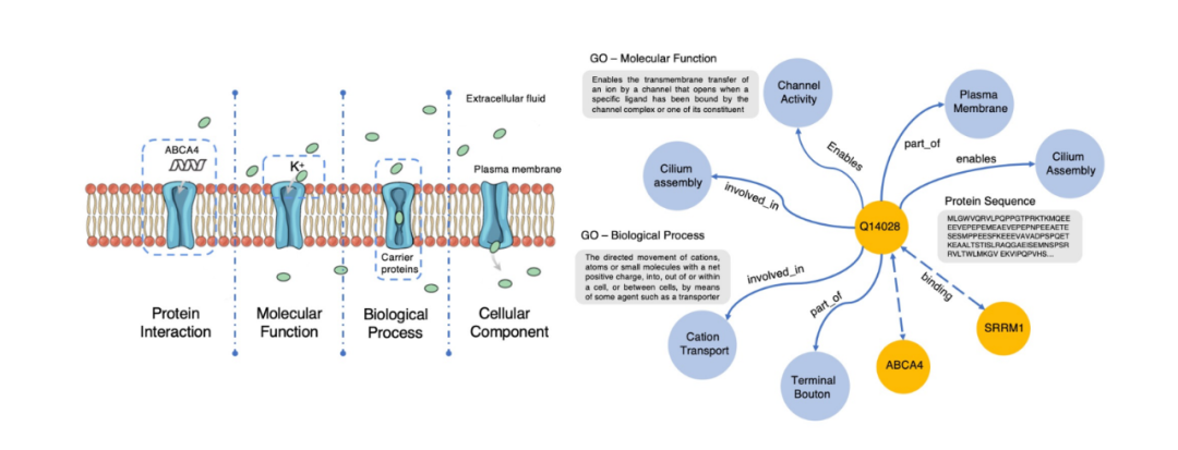 我们通过访问公开的基因本体知识图谱“Gene Ontology(简称 Go)”,并将其和来自 Swiss-Prot 数据库的蛋白质序列对齐,来构建用于预训练的知识图谱 ProteinKG25,该知识图谱包含 4,990,097 个三元组,其中 4,879,951 个蛋白质-Go 的三元组,110,146 个 Go-Go 三元组,并已全部开放供社区使用。如下图所示,基于“结构决定功能”的思想,如果在蛋白质预训练过程中显式地告诉模型什么样的结构具备什么样的功能,显然能够促进如蛋白质功能预测、蛋白质交互预测等任务的效果。