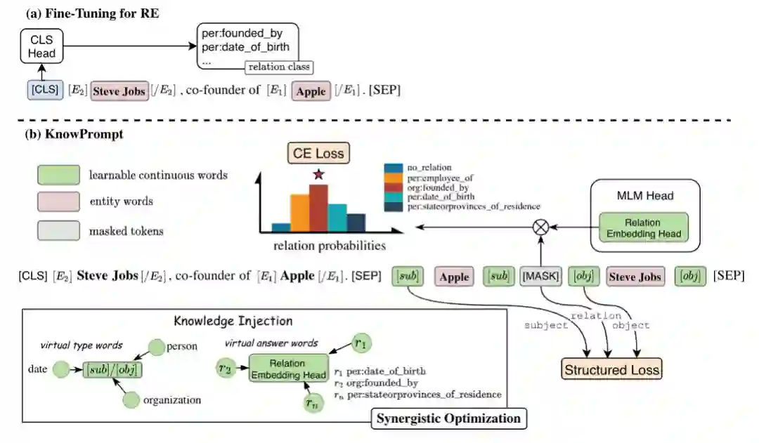 受此启发,我们将实体关系约束知识植入提示学习过程,并提出了 KnowPrompt 方法。我们通过可学习的虚拟答案词和虚拟类型词构建知识注入的提示,并通过实体关系约束植入外部结构化知识,以降低模板构建成本并提升任务对领域任务的感知。