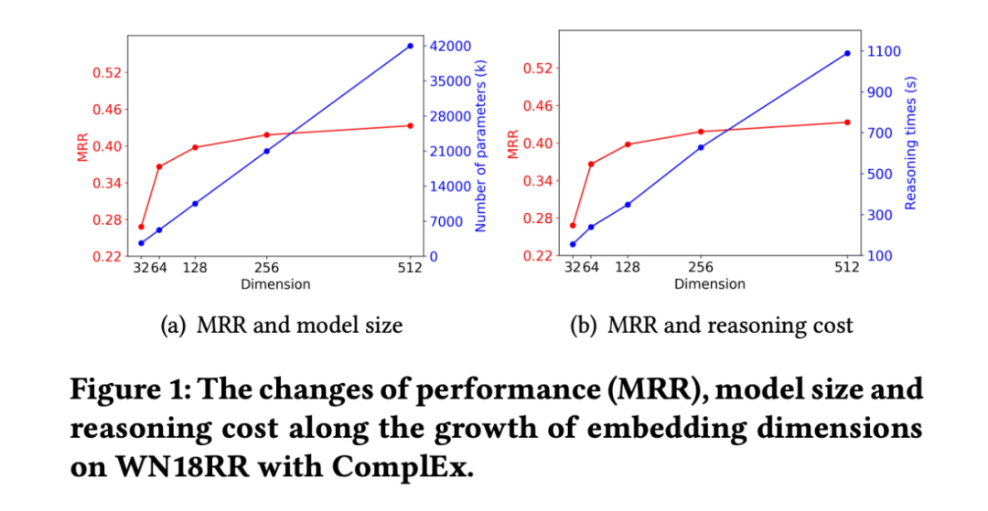 但是模型大小(参数的数量)以及推理时间的成本通常随 embedding 维度的增加而快速增加,如图 1 所示:随着 embedding 维度的增大,性能增益越来越小,而模型大小和推理成本却仍几乎保持线性增长。此外,高维 KGE 在许多现实场景中是不切实际的,尤其是对于计算资源有限或者是在推理时间有限的应用中,低维的 KGE 是必不可少的。然而,直接训练一个小尺寸 KGE 通常表现不佳,我们进一步提出一个新的研究问题:是否有可能从预训练的高维 KGE 中获得低维 KGE,在更快成本更低的情况下取得良好的效果。