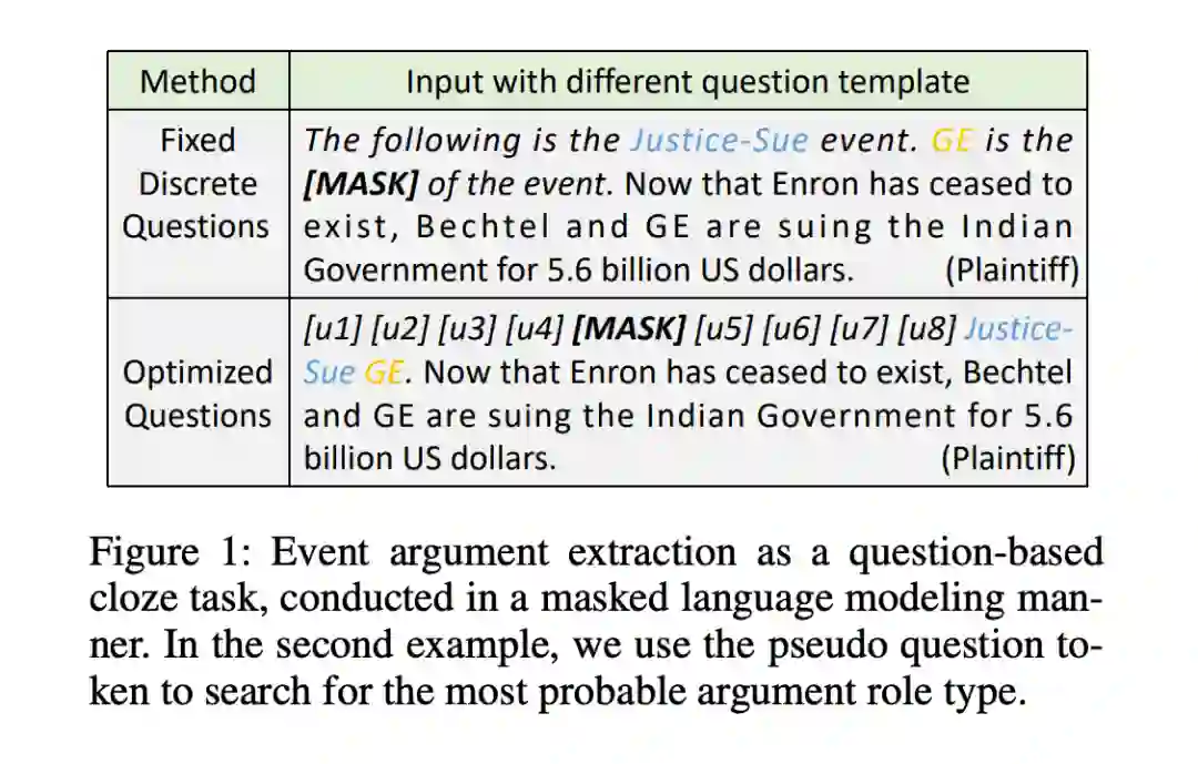 由于不同的提问策略会对事件提取方法的性能产生不同的影响,我们提出了一种新颖的 Learning to Ask (L2A) 方法,通过反向传播优化问题模板,可以在连续嵌入空间中自动搜索最佳的伪问题令牌。如图 1 所示,我们将一个问题与输入的句子连接起来,并利用 [MASK] 来指示后续预测的事件类型。从而事件参数提取作为一种基于问题模板的完形填空任务,以掩码语言建模的方式进行。在第二个优化模板的例子中,我们使用伪问题令牌来搜索最可能的事件参数角色类型。