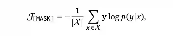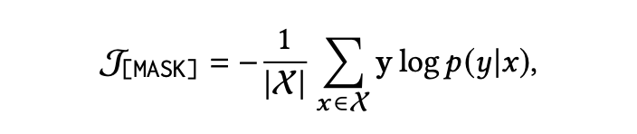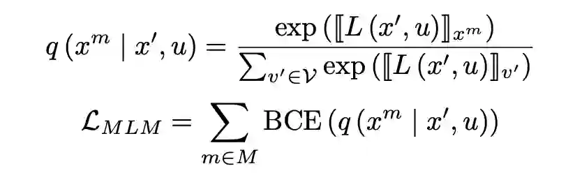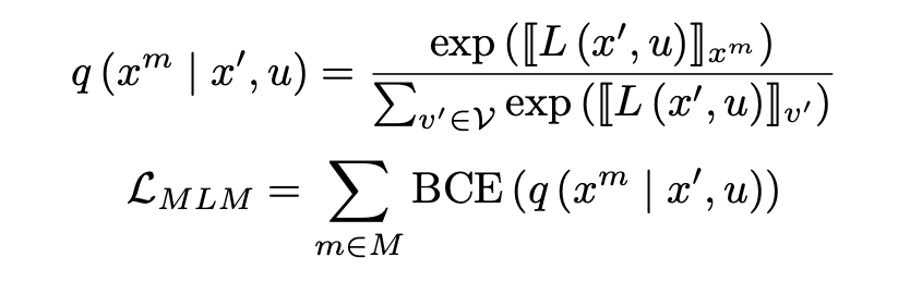 为交叉熵损失函数。为了使输入文本更接近自然语言,我们利用了一个辅助优化对象。我们随机掩蔽句子中的其他标记,并进行掩蔽语言模型预测如下: