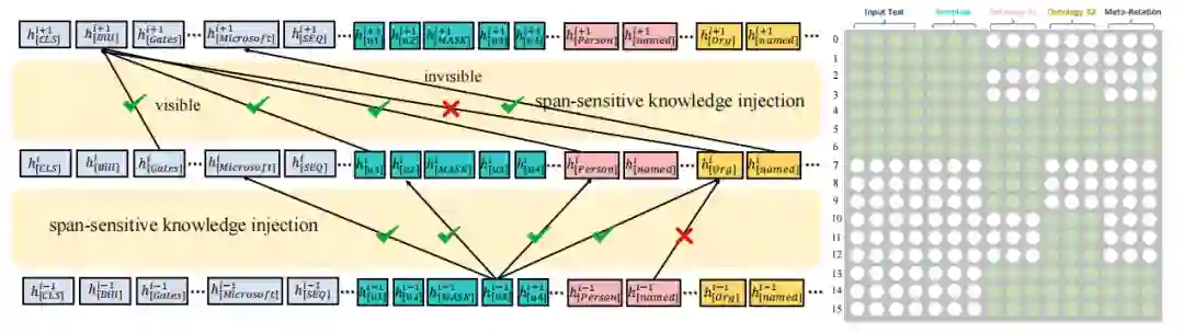 由于不加选择的知识植入可能会给原始文本引入一些噪声,并导致性能下降。为了解决这一问题,受到 K-BERT 启发,我们提出了跨片段选择性知识植入方法。如下图所示。我们使用一个可见矩阵来限制知识注入对输入文本的影响。在语言模型体系结构中,我们在 softmax 层之前添加了具有自注意权重的注意掩码矩阵。