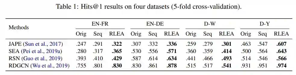 本文选取了数个性能领先且具有不同特点的实体对齐模型作为对比,并在 OpenEA 数据集上进行了实验。结果如下表所示:本文所述方法 RLEA 在全部四种数据集上均相较原有方法有明显提升。Seq 为仅仅采用序列决策而不涉及强化学习的对比方法,可以看出,其仍在绝大多数情况下也优于目前所采用的贪心策略。