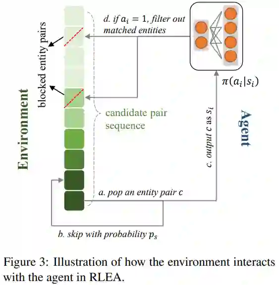 下图中展示了学习过程中,策略网络是如何与环境(Environment)互动的。在环境中维持了一个匹配对序列,其排序方法为实体对间的相似度,以保证在测试阶段该序列仍可用。如前文所述,相似度高的实体对未必真正匹配,因此在训练过程中本文通过对比实际标签与相似度信息来判断一个匹配对的难易程度,根据当前训练轮数,一些较高难度的匹配对将有更大的概率直接逃过训练。在一个情节(Episode)中,环境所给出的实体对将被策略网络一一判断,被认为匹配的实体对将会直接排除环境序列中的所有涉及这些实体的匹配对,这一过程一直持续到序列终止或所有实体均被匹配。