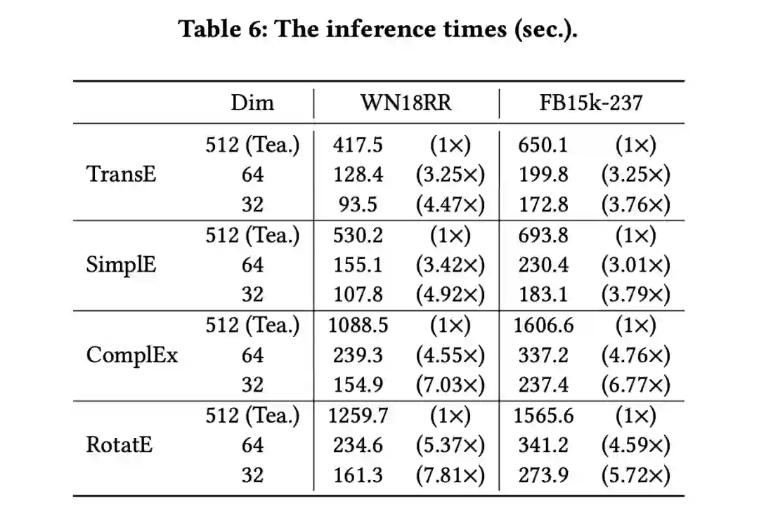3. 我们通过实验证明,我们的方案可以在很少的性能损失基础上,将高维 KGE 的嵌入参数减少 7-15 倍,并将推理速度提高约 2-6 倍。