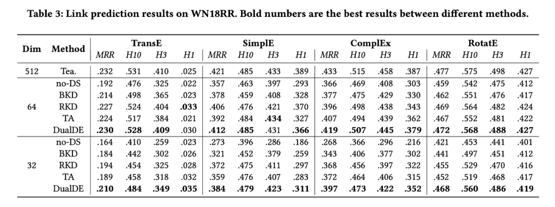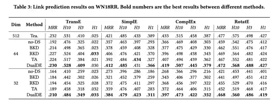 DualDE 在常用地数据集 WN18RR 和 FB15K237 上进行了实验,与几个当前先进的蒸馏方法相比,DualDE 体现了优越的性能。下面是部分实验结果。