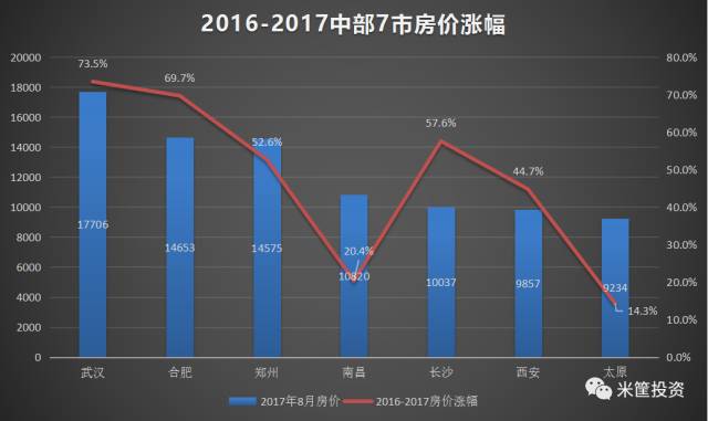 从房价看,武汉>合肥>郑州>南昌>长沙>西安>太原。武汉以1.7万的房价领跑,经历暴涨的合肥甚至超过郑州,都在1.4万元左右。而南昌、长沙、西安的房价还在1万左右徘徊。