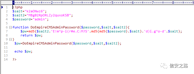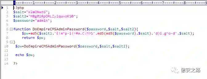 直接 copy 该函数,本地环境新建下面 php 文件,测试密码 admin 的加密输出