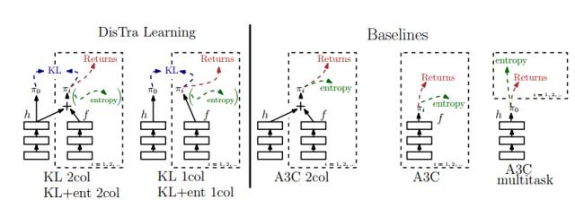 图 2: 不同算法和基线的描述。左侧是 Distral 算法中的两个,右侧是 3 个 A3C 基线。熵(entropy)在括号之内,因为它是可选择的,且只用于 KL+ent 2col 和 KL+ent 1col。